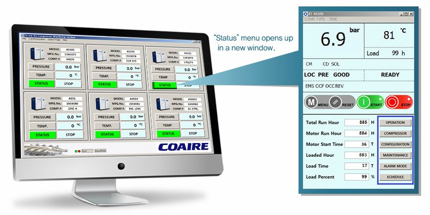 SCREW MONITORING SYSTEM is a system for central monitoring and control for multiple Regular SCREW and VSD SCREW compressors. It allows to monitor the status of the compressors and operate from one control point using RS485 network.